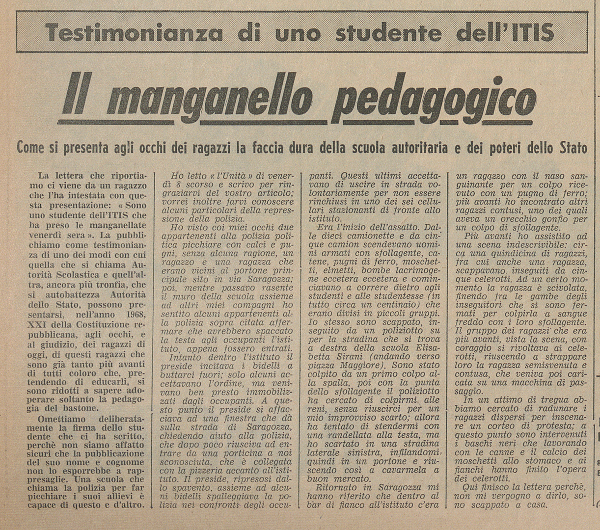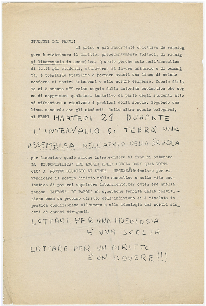 A partire dal 1967, nelle scuole bolognesi cominciano una serie di manifestazioni, assemblee e occupazioni che negli anni successivi coinvolgeranno tutti gli istituti superiori bolognesi.