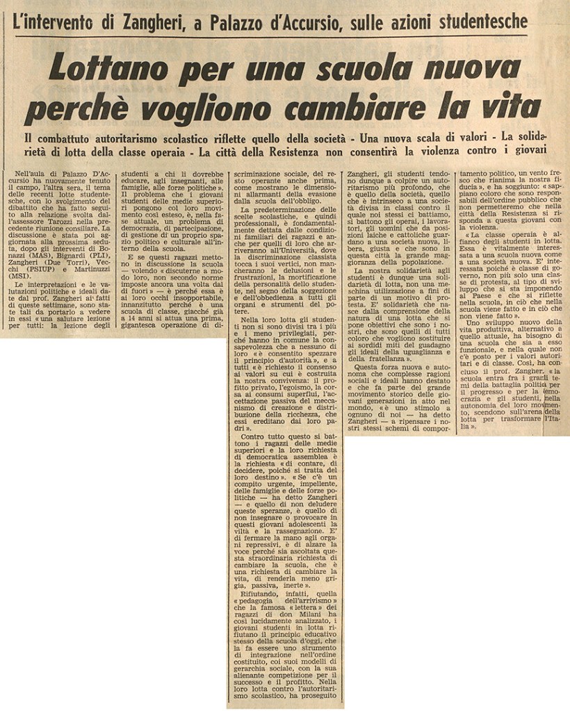 L’assessore all’Istruzione, Ermanno Tarozzi, e i consiglieri di maggioranza, tra cui Renato Zangheri, dichiarano di condividere le ragioni della lotta degli studenti per la democrazia nella scuola e per la giustizia sociale, mentre i consiglieri liberali e missini si schierano contro il movimento studentesco.