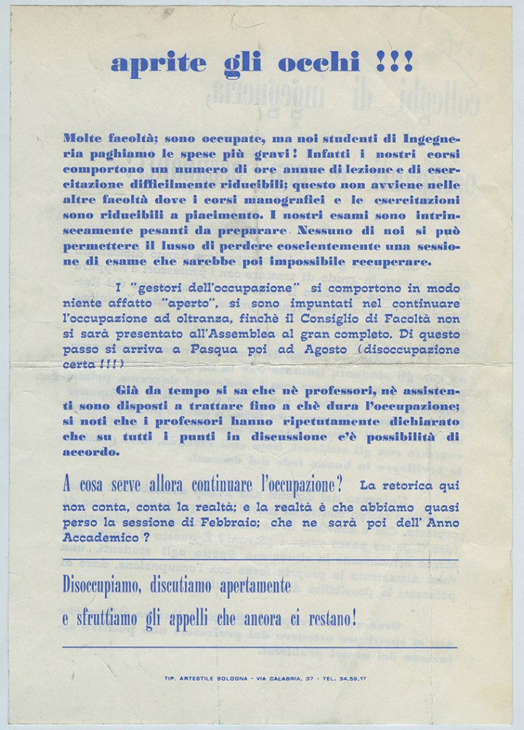 Il ’68 degli studenti universitari bolognesi inizia già nei primi mesi del 1967. Negli ultimi giorni di gennaio vengono occupati in rapida successione diversi istituti e l’aula magna dell’Ateneo, provocando il rinvio dell’inaugurazione dell’anno accademico.