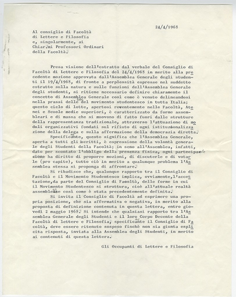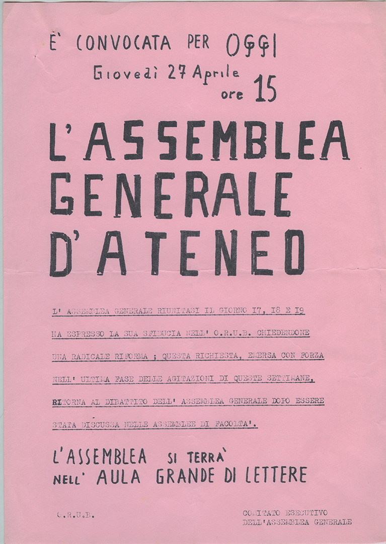 Parallelamente al rifiuto dei vecchi “parlamentini” studenteschi e al rigetto dell’istituto della delega si afferma la nuova forma assembleare come ambito collettivo di discussione e di elaborazione politica e come unico organismo autenticamente rappresentativo delle istanze degli studenti. L’assemblea generale, nelle sue molteplici declinazioni (d’Ateneo o all’interno delle singole facoltà), non costituisce soltanto il luogo fisico della pratica politica del movimento studentesco ma si configura anche come il solo soggetto che è di fatto legittimato a intrattenere rapporti con le autorità accademiche e il corpo docente.