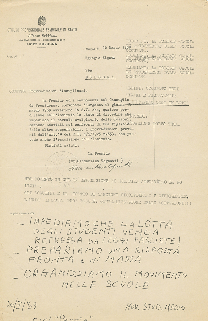 A partire dal 1967, nelle scuole bolognesi cominciano una serie di manifestazioni, assemblee e occupazioni che negli anni successivi coinvolgeranno tutti gli istituti superiori bolognesi.
