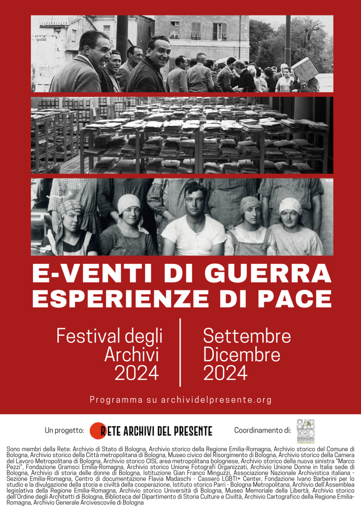 Nei mesi di ottobre, novembre e dicembre 2024 si terrà a Bologna il primo “Festival degli archivi” dal titolo E-venti di guerra, esperienze di pace. L’iniziativa, che intende ragionare sulla ricorrenza dell’ottantesimo del 1944/1945 ma che guarda anche ad altri drammi del Novecento col proposito di riflettere sugli interrogativi del tempo presente, prevede lo svolgimento di trekking, mostre, conferenze e spettacoli che occuperanno alcuni tra i più importanti spazi culturali bolognesi.