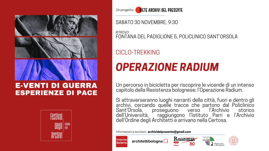 Si attraverseranno luoghi narranti della città, fuori e dentro gli archivi, cercando quelle tracce che partono dal Policlinico Sant’Orsola, proseguono verso l’Archivio storico dell’Università, raggiungono l’Istituto Parri e l’Archivio dell’Ordine degli Architetti e arrivano nella Certosa.