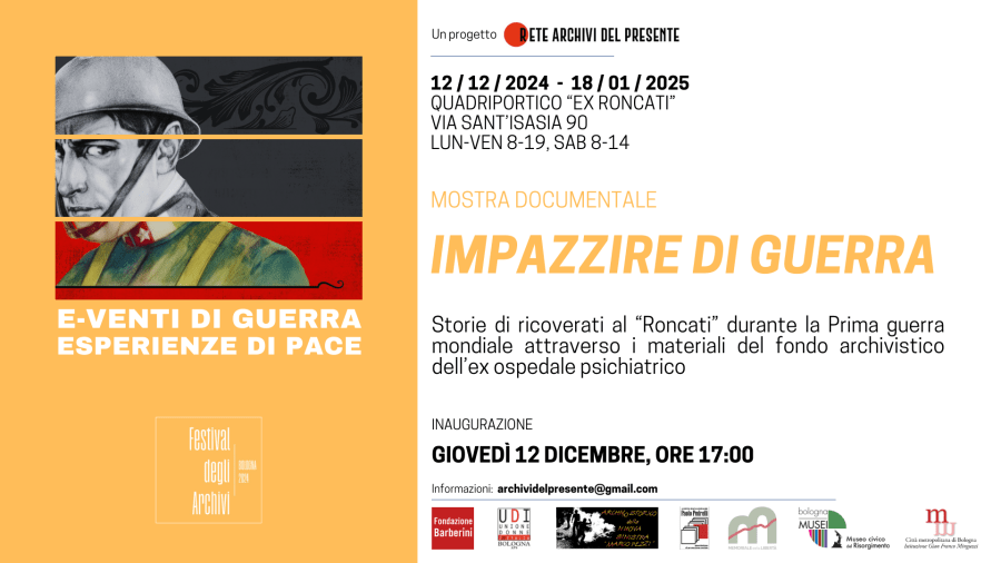 Mostra: Impazzire di guerra Quadriportico ex RoncatiVia Sant’Isaia 90La mostra può essere visitata dal 12 dicembre 2024 al 18 gennaio 2025, da lunedì a venerdì dalle 8 alle 19, sabato dalle 8 alle 14Inaugurazione giovedì 12 dicembre 2024, ore 17 Condividi: Fai clic per condividere su X (Si apre in una nuova finestra) X Fai clic per condividere su Facebook (Si apre in una nuova finestra) Facebook Mi piace Caricamento... Correlati