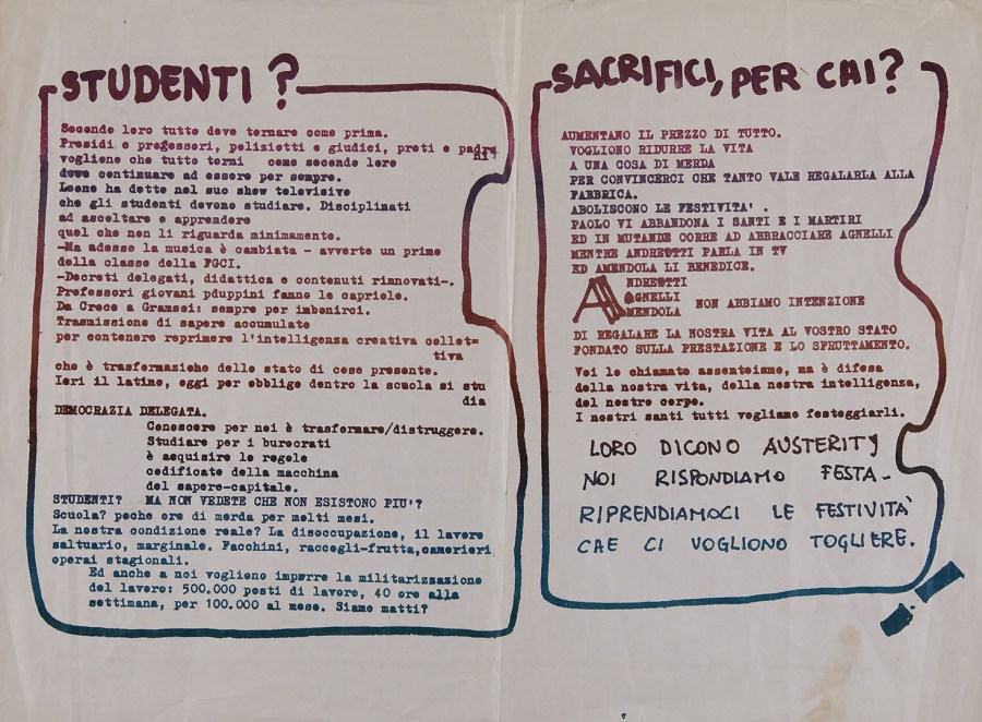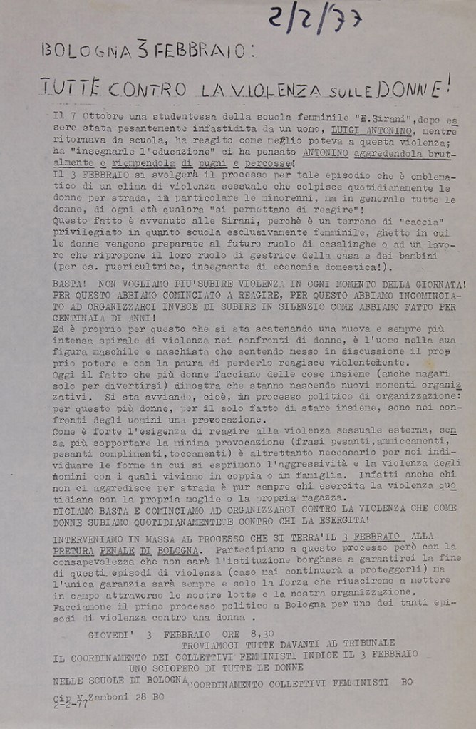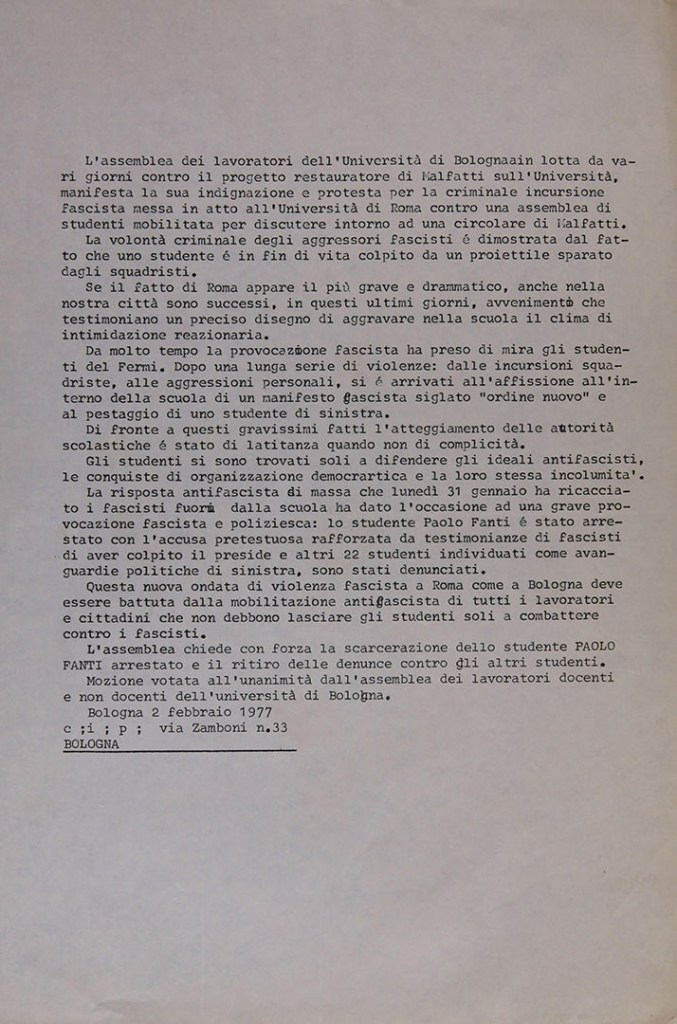 Dal febbraio 1976 inizia a trasmettere Radio Alice, una emittente “libera” animata in parte da studenti provenienti dall’area di Autonomia e dall’area libertaria. La sede della radio è in via del Pratello. Durante il 1977 si fa portavoce del movimento studentesco.