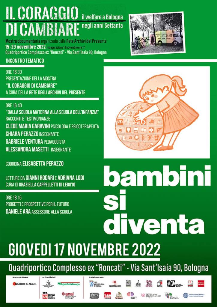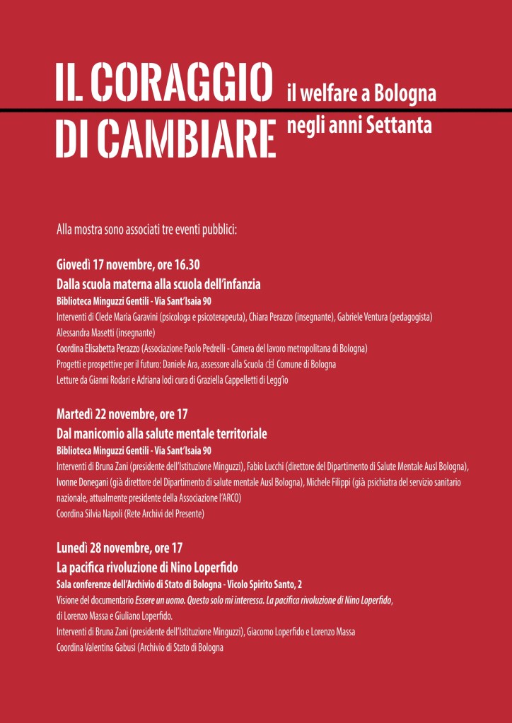 Lunedì 14 novembre alle ore 17 verrà inaugurata la mostra Il coraggio di cambiare. Il welfare a Bologna negli anni Settanta, organizzata dalla Rete Archivi del Presente, una rete informale nata dall’iniziativa di alcuni archivi pubblici e privati bolognesi, interessati a collaborare su progetti di valorizzazione del patrimonio culturale.